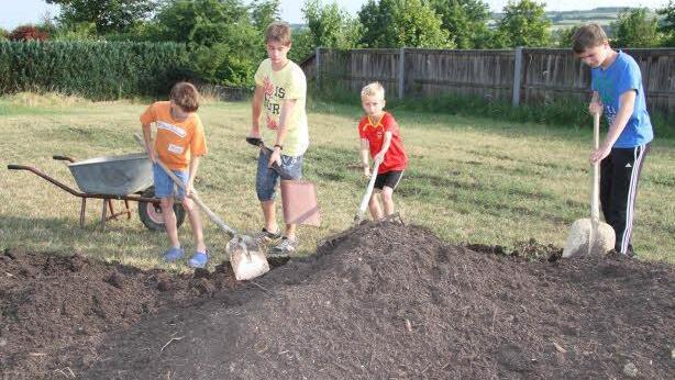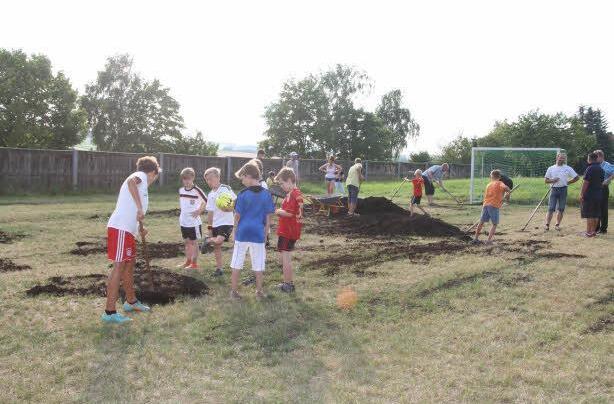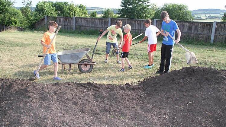 Nicht nur die Jüngeren haben ihren Spaß, auch die schon etwas älteren Jungs spielen auf dem neuen Bolzplatz Fußball. "Wir brauchen den Bolzplatz zum Fußball spielen, das ist doch klar", sagt Lucas Landel (13), der ebenfalls von Anfang an mitgeholfen hat. Lukas Gottwald (14) ist auch schon zur Stelle und Kevin Geier (13) ebenfalls. Leon Geier (7) packt sich eine Schaufel, und hilft mit - und auch Jonas Gottwald (12) lässt sich nicht zwei Mal bitten.