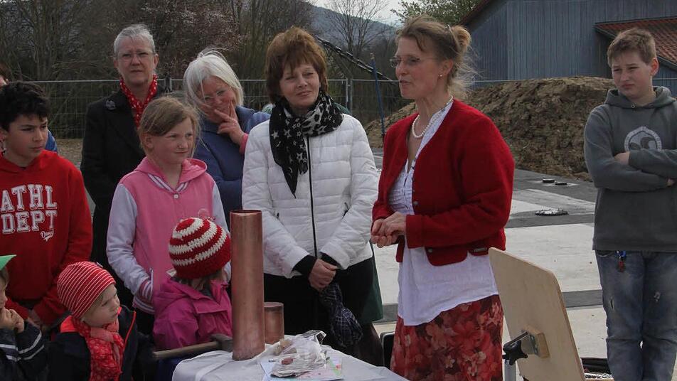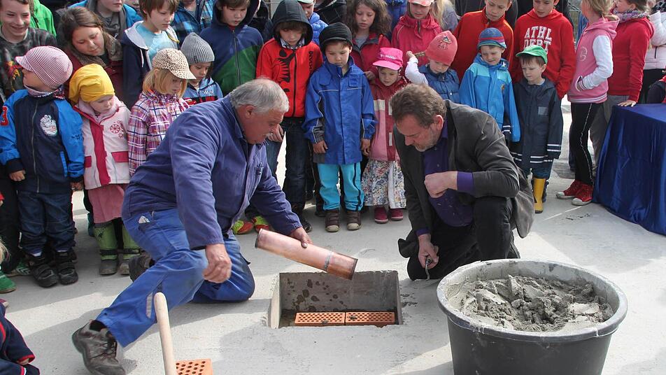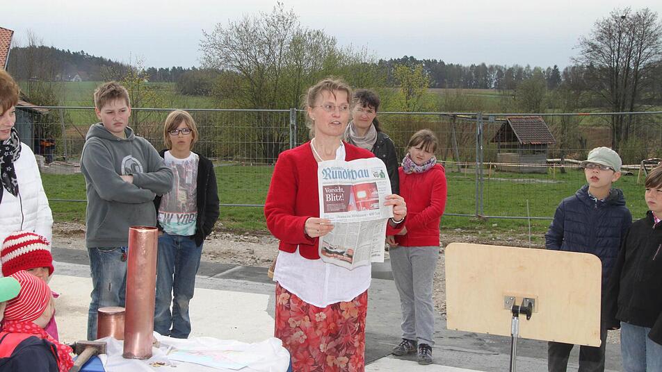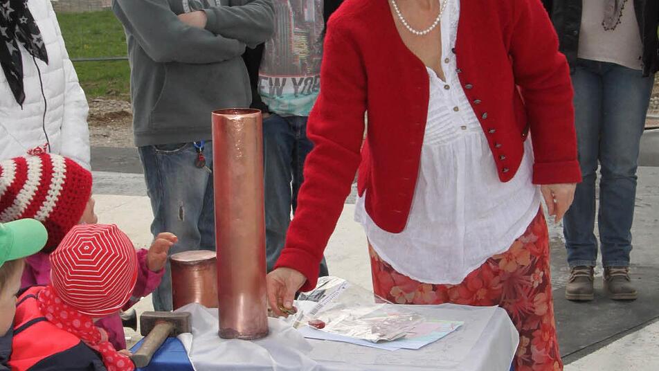 In das Fundament wurde eine Kupferrolle einbetoniert, in die Franziska Bartel Geld, eine Seite der Bayerischen Rundschau, ein Kristall, Füller und Stift sowie Bilder der Kinder gab.