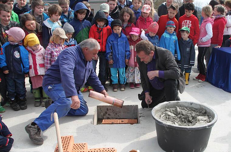 Die Grundsteinlegung nahmen - beobachtet von den Kindern - dann Josef Witzgall von der Firma Mattis und Joachim Gutschmidt vom Vorstand der Waldorfschule vor. Natürlich ließen es sich ein paar Jungs der Waldorfschule nicht nehmen, selbst mit anzupacken. Die Jungen und Mädchen hatte die Feierstunde auch mit Liedern und Gedichten umrahmt.