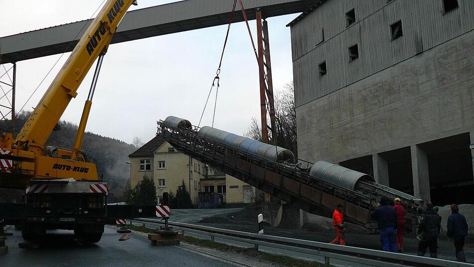 Gleich früh rückten die Firma Elma aus Eschenbach und ein Klug-Autokran aus Bindlach dem Förderband zu Leibe. Der Schwerlastkran nahm das 14 Tonnen schwere Gerät auf den Haken, die letzten Bolzen wurden mit dem Schweißbrenner abgetrennt - und schon kurz vor 9 Uhr schwebte das Förderband sanft zu Boden. Es wird neben der Aufbereitungsanlage zwischengelagert und später verschrottet.