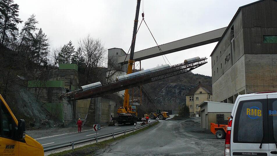 Wie berichtet, waren die Abbrucharbeiten der Startschuss für ein großes Neubau- und Modernisierungsprojekt im Werk Kupferberg. Deshalb müsse das in die Jahre gekommenen Förderband, das vom Steinbruch über die Bundesstraße zur Aufbereitungsanlage führte, abgebaut werden, so Technischer Leiter Michael Weidemann.