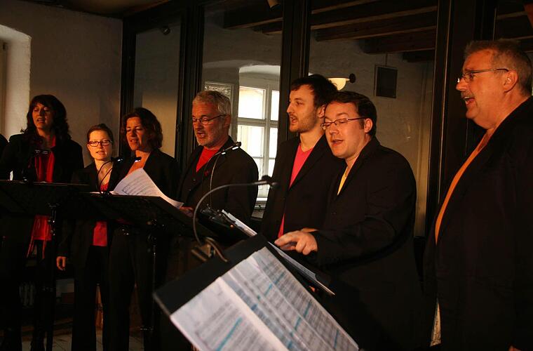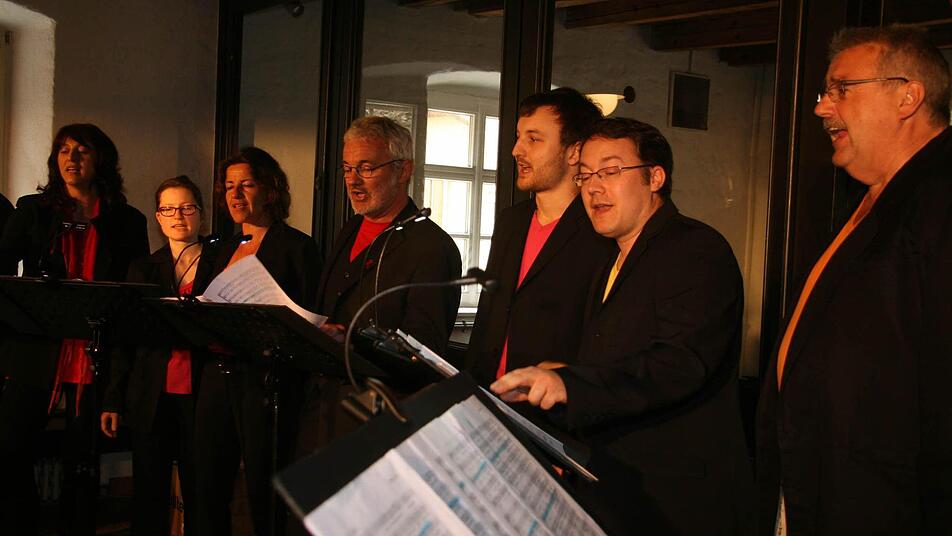 Die Stimband-Mitglieder wohnen in München und Mannheim, Erlangen, Hollfeld, Stadtsteinach und Kulmbvach, und so ist die Koordination regelmäßiger Proben für das A-Capella-Ensemble nicht einfach. Trotzdem stimmt der Sound. Mit "Fly me to the moon" und Lenas "Satellite" eröffneten sie das Programm.