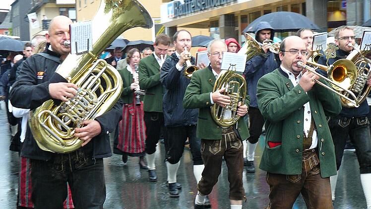 Mit wetterfester Kleidung oder bewaffnet mit Regenschirm ging der bunte Zug unter den Klängen des Musikvereines dann trotzdem über die Bühne.