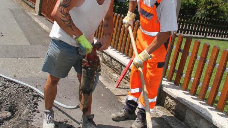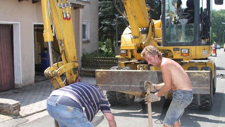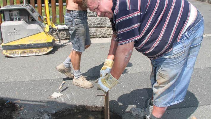 Bürgermeister Roland Wolfrum hatte den Beginn der Sanierungsarbeiten auf Mitte Juli angekündigt, jetzt ist es soweit: Die Baufirma Günther Bau rückte mit Lastwagen, Presslufthammer und schwerem Gerät an. Ralf Licht setzte den Presslufthammer an. Unterdessen versuchten seine Kollegen Eberhard Richter und Hans Vogel mit vereinten Kräften, einige Meter weiter einen Kanaldeckel herauszuheben.