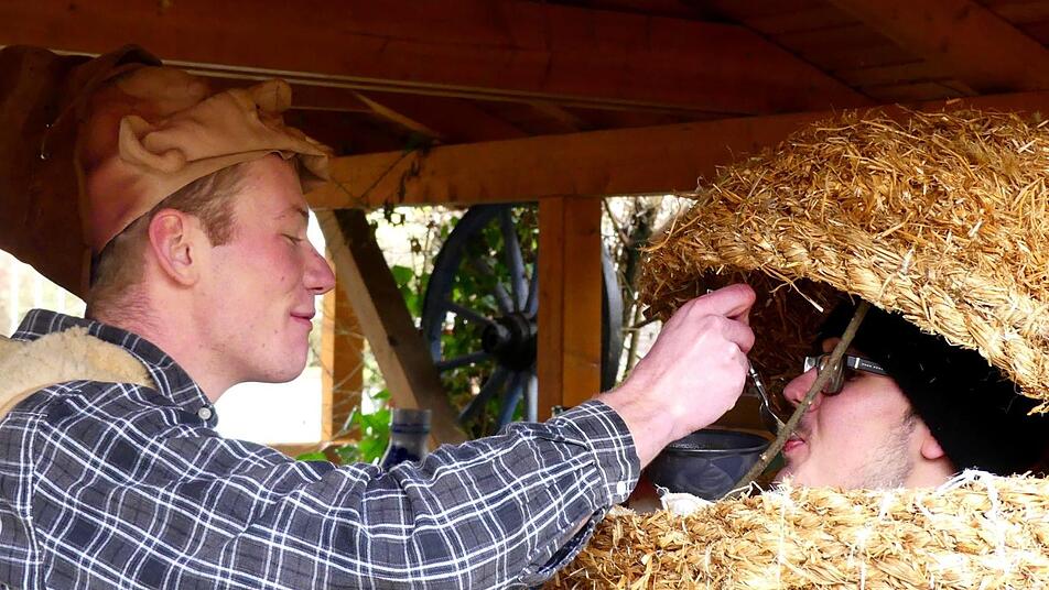 Nach einem Weißwurst-Frühstück um 6 Uhr morgens am Treffpunkt darf nicht zu viel Zeit verloren werden, denn allein das "Ankleiden" der Hauptfigur dauert über drei Stunden. Solange steht der arme Kerl mitten im Raum, die Arme waagerecht auf zwei Jungs gestützt. Acht von ihnen sind um ihn herum damit beschäftigt, ihn mit den einzelnen, ein bis eineinhalb Meter langen Strohzöpfen einzuwickeln. Je nach Fortschritt dieser Arbeit funktionieren ein Toilettengang, Essen und Trinken nicht mehr ohne Hilfe. Kein Problem für das eingespielte Team.