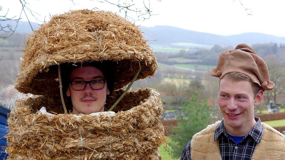 Das unangenehm nasse Wetter erschwert der "Strohberta" und ihren Begleitern den traditionellen Umzug durch Trebgast.