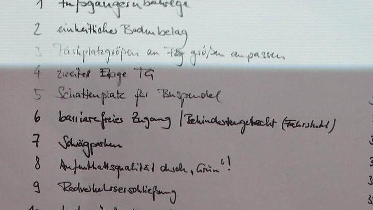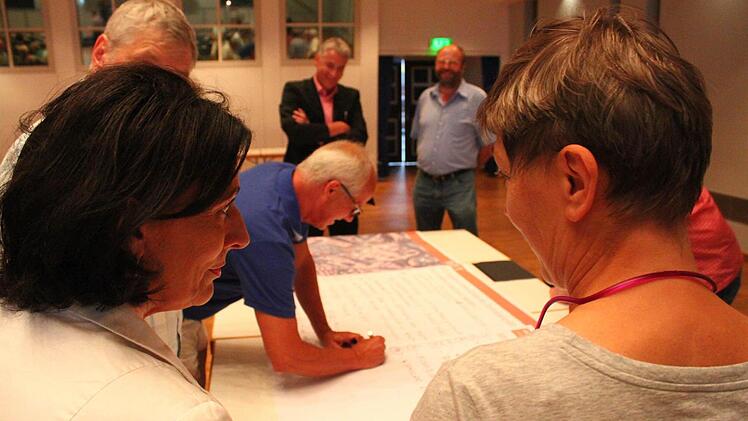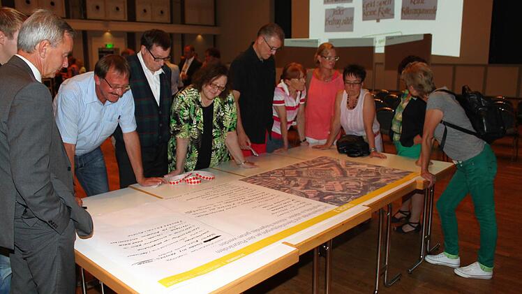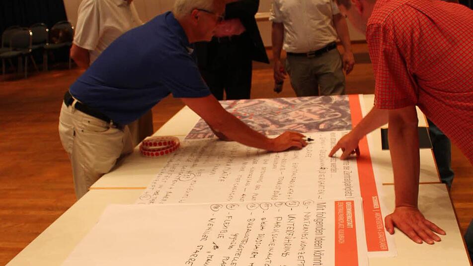 Jeder Vorschlag zählt An drei Tischen in der Dr.-Stammberger-Halle überlegten die rund 50 Besucher, was man besser machen kann. Architekt und Stadtplaner Martin Schirmer aus Würzburg, der die Veranstaltung moderierte und leitete, hatte von vorne herein klargestellt: Jeder Vorschlag zählt. Es werden Ideen gesammelt - es wird nicht darüber diskutiert. Geld spielt bei den Vorschlägen zunächst keine Rolle.