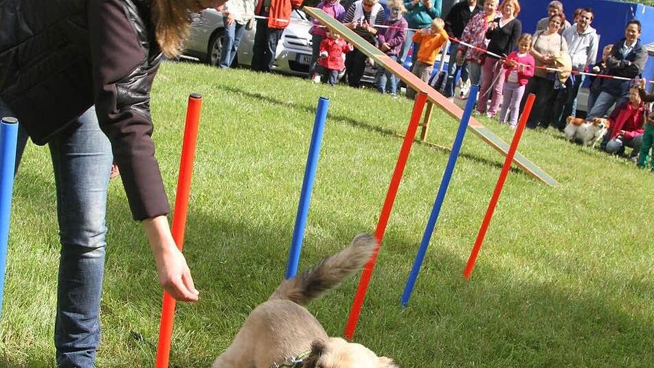 Franzi und der Flummi Ganz anders dagegen verhält es sich mit Franzi, einem drei Jahre alten reinrassigen Entlebucher Sennenhund. Dabei handelt es sich um eine seltene, sehr temperamentvolle Schweizer Hunderasse. "Slalom kann er sehr gut. Und er kann auch eine Rolle - auf Kommando", erklärte Silke Kuczius. Und tatsächlich. Einfach auf Handzeichen rollte sich Franzi im Gras.