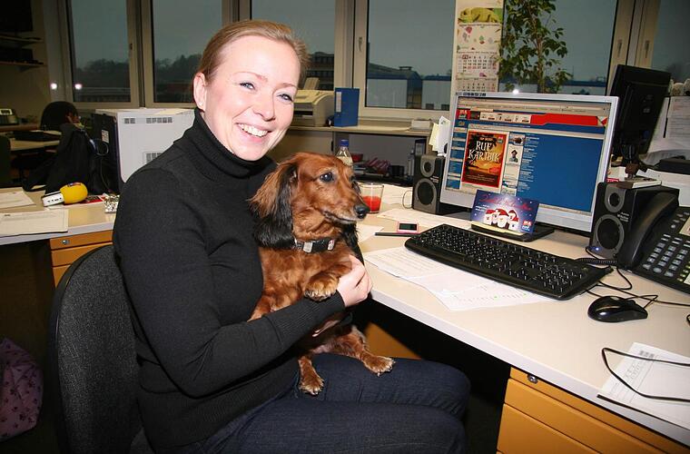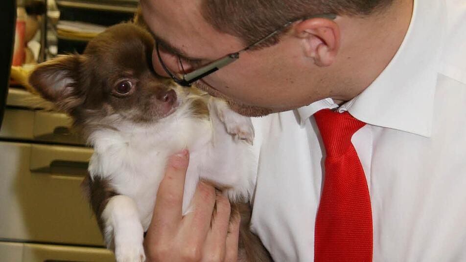 Doch Cindy ist nicht der einzige Vierbeiner in Kulmbach, der mit ins Büro darf. Auch bei Vermögensberater Sebastian Resch (27) und seiner Freundin Katja di Lascio (21), die in der gleichen Firma eine Ausbildung zur Finanzkauffrau macht, darf der beste Freund der beiden nicht fehlen.