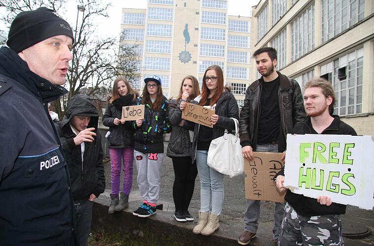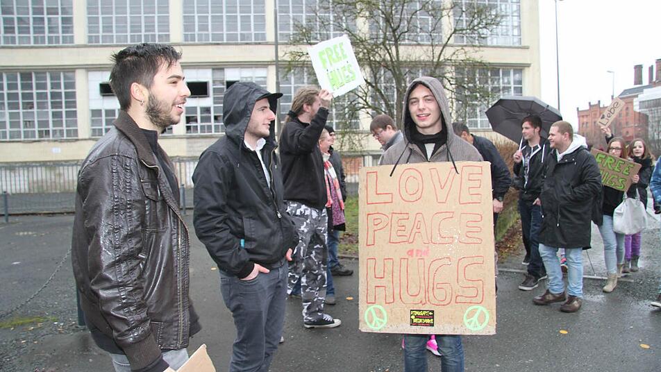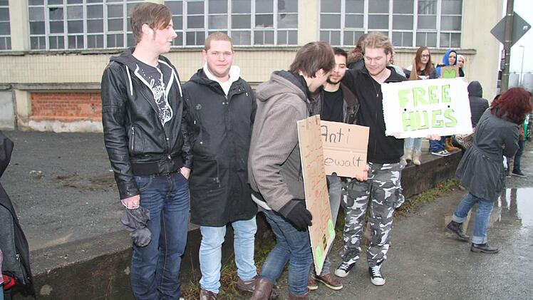 "Umarmung", "Liebe", "Anti-Gewalt" und "Free Hugs!" stand auf den Schildern, die sich die Jugendlichen selbst gemalt hatten. Rund fünfzig Jugendliche, darunter auch die "Randale-Kids" selbst, wollten am Bahnhof ein Zeichen setzen. Sie möchten, dass die Streitigkeiten endlich aufhören. Eigentlich wollten sie im Bahnhof auf die Bahnreisenden zugehen und diese umarmen. Doch im Vorfeld hatte die Bahn das verboten.