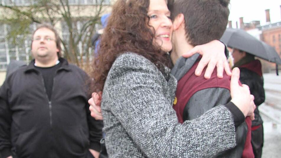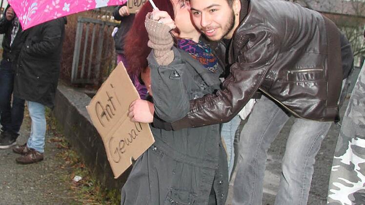 "Das ist schon wichtig hier", sagte Jacqueline Kummer (17). Und auch ihre kleine Schwester Celina Kummer und Freundin Lisa Marie Tölch (13) waren mit dabei. Die Jugendlichen kennen die Situation am ZOB, und die ist nicht gut. "Ich hab die ganze Familie dabei, ich hätte auch meine Oma mitgenommen, aber es ist zu nass und zu kalt. Die ist ja schon über siebzig", sagt Pascal Luthardt und wünscht sich nur eins: Frieden am Bahnhof. "Ich finde die Aktion ist super", kommentierte Stadträtin Doris Stein von den Grünen und lobte vor allem die Friedlichkeit. Auch sie ließ sich umarmen.