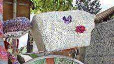 Das Fahrrad ist komplett umstrickt: mit meliertem Garn in zartem Lindgrün, leuchtendem Rot, lila und weiß. Die Speichen sind mit einem roten Strickliesel-Schlauch verziert. Und das ganze Gestell ist von leuchtendem Rot umgarnt. Weil nicht mehr genug rote Wolle vorhanden war, sind kleine Streifen in Pink und Weiß als Kontrast eingesetzt. Der Lenker sorgt mit sattem Löwenzahn-Gelb und Orange sowie Pinktönen für Aufmerksamkeit. Auch der Sattel hat einen weichen Überzug bekommen: lila-weiß meliert. Sogar die Treter haben Hüllen. Und als Krönung ist das Fahrrad mit einem zarten Körbchen ausgestattet.