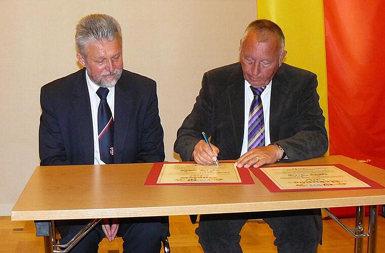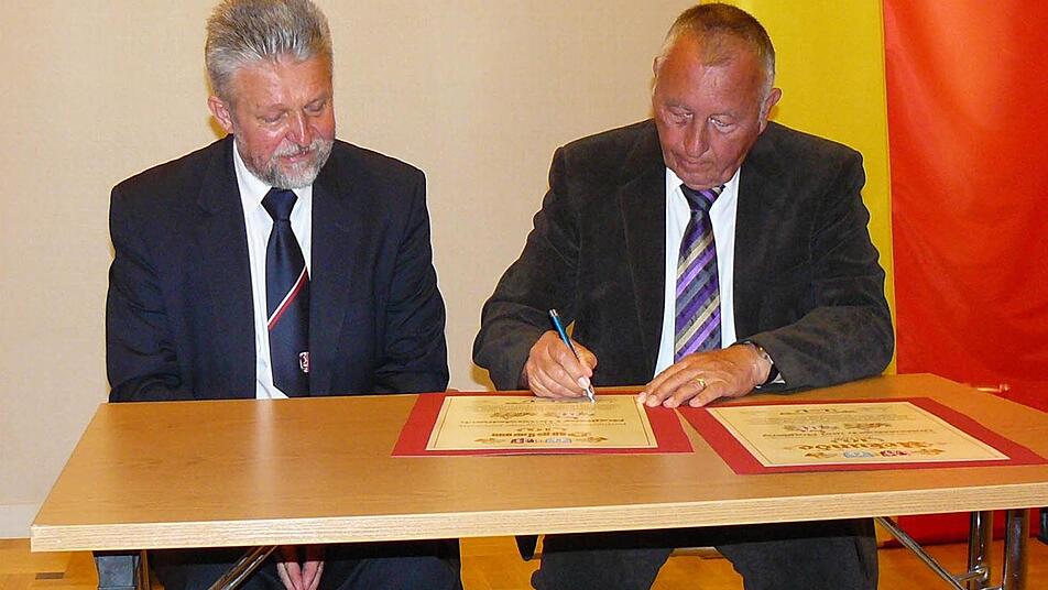 Urkunden unterzeichnet Gemeinsam unterzeichneten die Bürgermeister Krzystof Musial und Heinz Burges dann auch die in deutscher und polnischer Sprache ausgefertigten Urkunden zum zehnten Jubiläum, die Burges mitgebracht hatte, und tauschten sie aus. Weiter hatte das Untersteinacher Gemeindeoberhaupt eine Spende für die Jugend Mogilanys - die das Fundament der Partnerschaft ist -dabei. Nicht fehlen durfte ein Ortsschild von Untersteinach, das nun einen Ehrenplatz in der polnischen Gemeinde erhält.