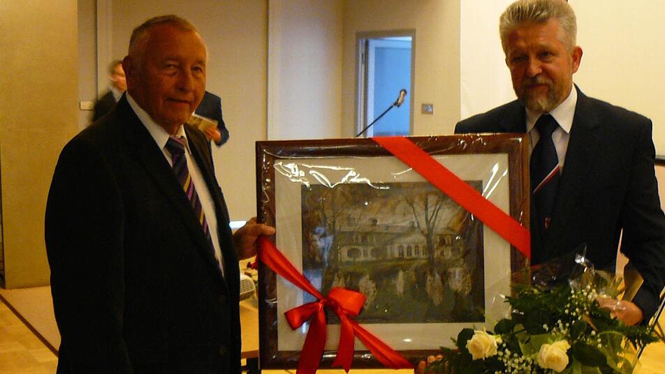 Musial bedankte sich bei seinem Untersteinacher Kollegen Heinz Burges für den Besuch zur zehnjährigen Partnerschaftsunterzeichnung in Mogilany. Als Gastgeschenk hatte Musial ein Bild des altehrwürdigen Gutshauses parat, das wertvoll für Mogilany ist.
