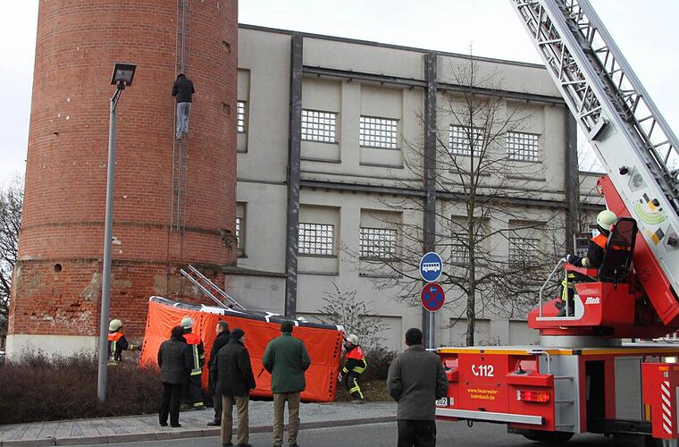 Im Einsatz sind etwa 50 Rettungskräfte von Polizei, Feuerwehr, BRK und Bergwacht. Unten am Turm hat die Feuerwehr ein Rettungskissen aufgebaut, das dann glücklicherweise nicht gebraucht wird. Die Feuerwehr spricht von der Drehleiter aus mit dem 23-Jährigen. Er lässt sich nach einer Stunde dazu bewegen, nach unten zu klettern, als Oberbürgermeister Henry Schramm gekommen ist. Mit ihm will der junge Mann sprechen, erhofft sich Hilfe in seiner Situation.