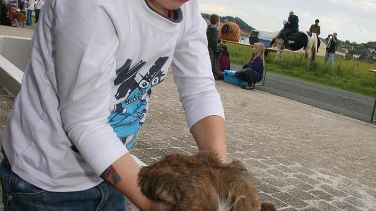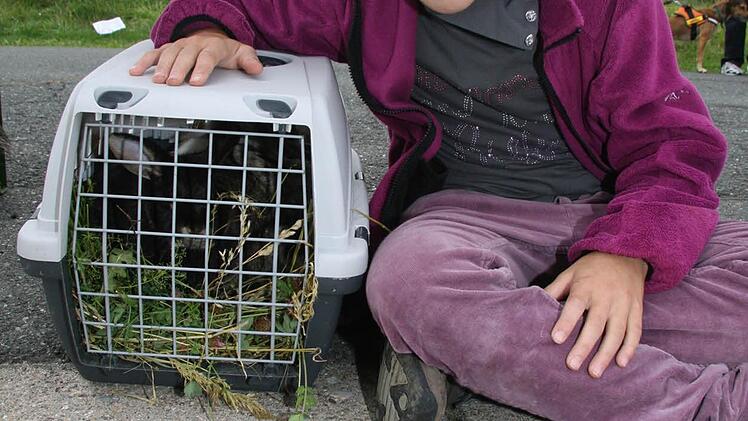 Die Besucher des Tiergottesdienstes haben auch viele Kaninchen mitgebracht. Felicia Ramming macht es sich mit ihren Langohren unter der Tischreihe bequem. Felix Hahn dagegen zeigt ungeniert sein Kaninchen "Timmy" und holte es aus dem Pappkarton, der gleich neben dem Pfarrer steht. Denn "Timmy" soll ja sehen, wie so ein Gottesdienst abläuft.