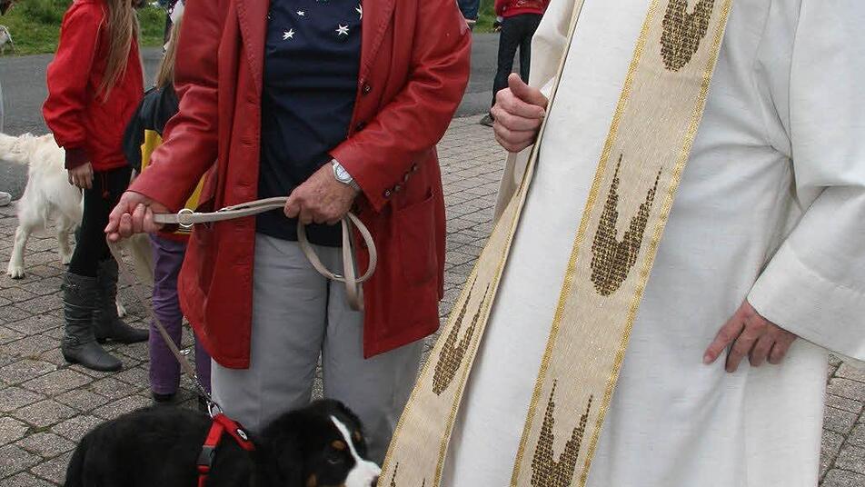 Den größten Hund hat Angelika Zapf dabei: den drei Jahre alten Landseer Joppe. Er bringt über 70 Kilogramm auf die Waage. Und sicherheitshalber steht Angelika Zapf ein bisschen im Hintergrund. Der jüngste Hund ist gerade einmal drei Monate alt. Dekan Roppelt muss sogar lachen, als der Berner Sennenhund seine Stola neugierig beschnüffelt.