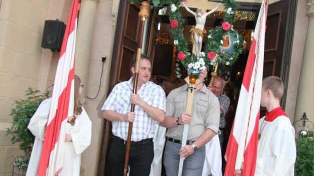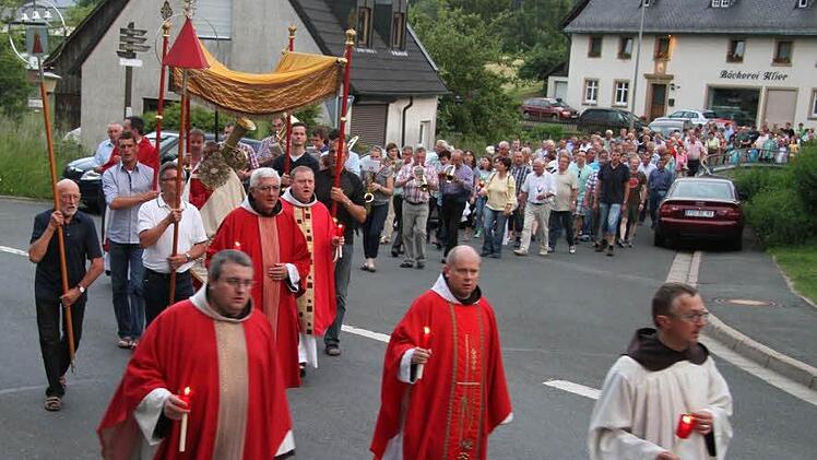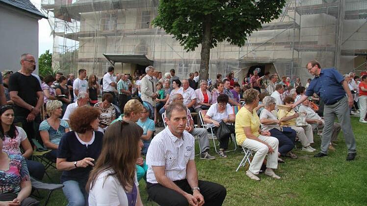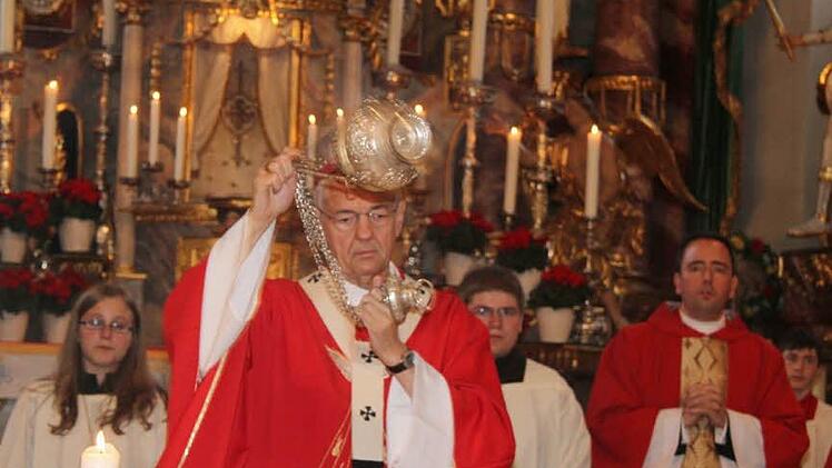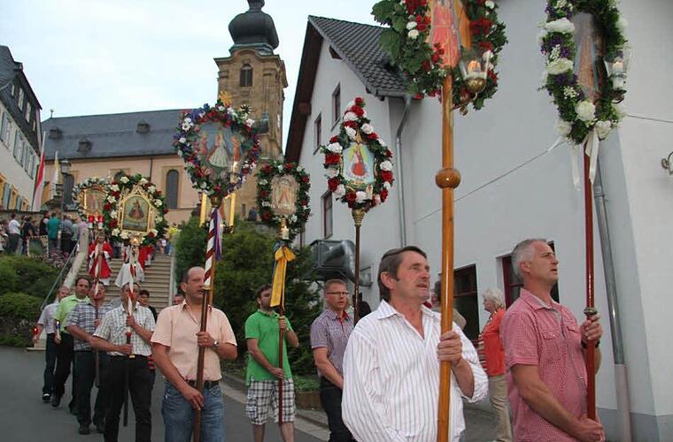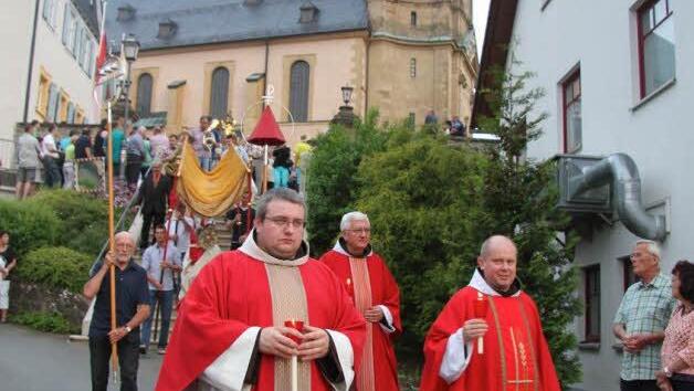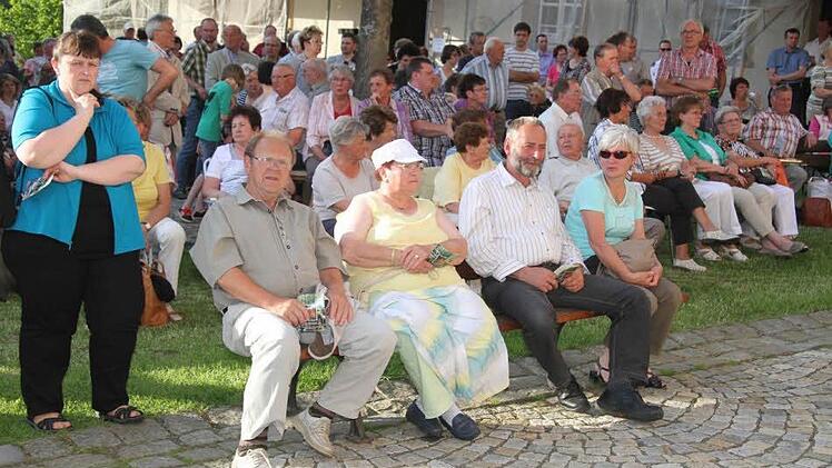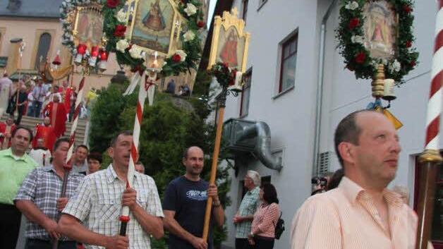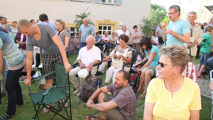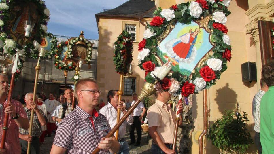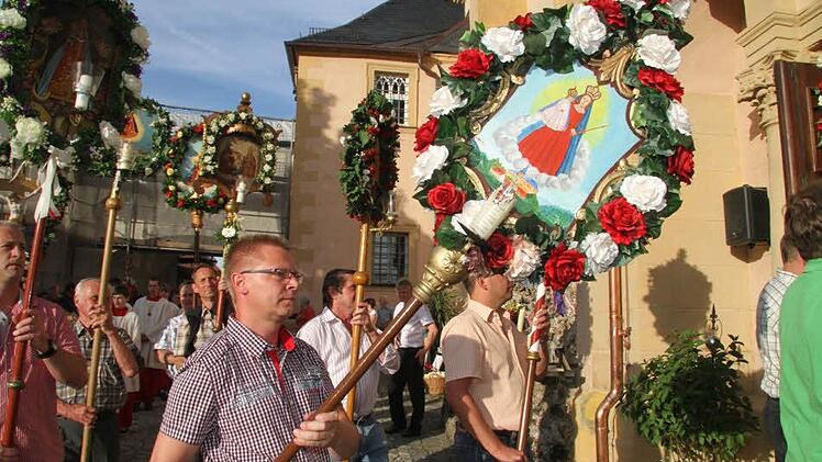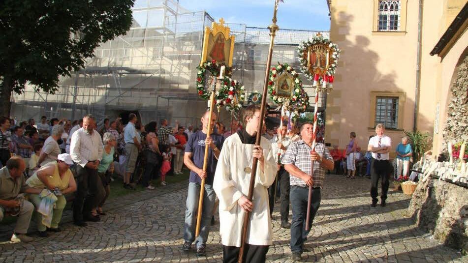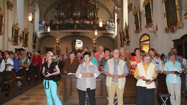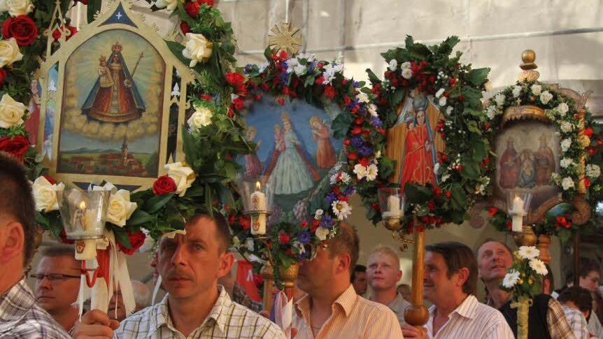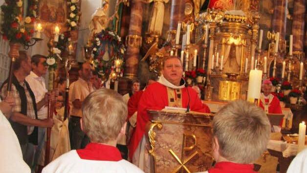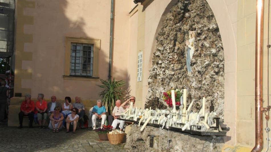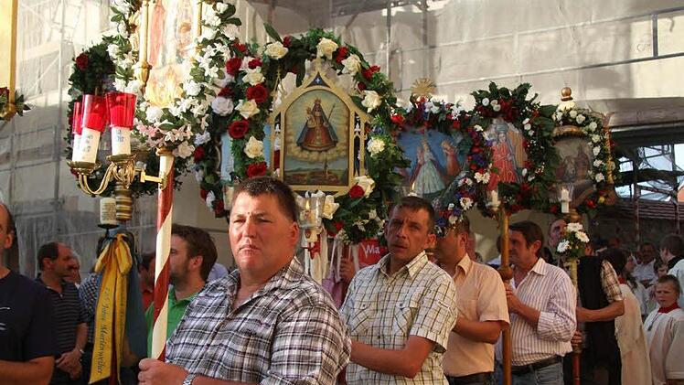 Bei herrlichem Sommerwetter und Temperaturen, die Fußpilgern den Schweiß auf die Stirn trieben, feiern die Menschen an diesem Wochenende das Hochfest der Wallfahrt in Marienweiher. Dutzende Pilgergruppen kamen aus nah und fern, tausende Menschen aus der ganzen Region kamen zum Auftakt der Pilgertage in die Päpstliche Basilika. Große und kleine Pilger waren dabei, junge und ältere Pilger, erfahrene Pilger, aber auch viele Neulinge. Es kamen so viele Menschen, dass die Basilika bis auf den letzten Platz gefüllt war, die Menschen in den Gängen standen und auch auf dem Platz vor der Basilika herrschte dichtes Gedränge. Viele Pilger hatten sich Klappstühle mitgebracht oder ließen sich einfach im Gras nieder.