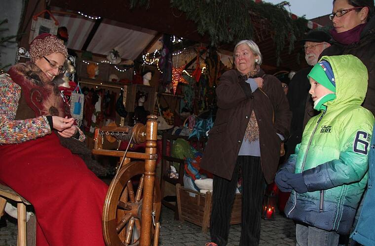 Spinnrad dicht umlagert Beim Weihnachtsmarkt im Oberhacken gab es viel zu sehen. Immer dicht umlagert war Silvana Pezzi mit ihrem Spinnrad. Für Aufsehen sorgte auch Holzsäger Michael Schütt aus Bindlach. Es gab Dekoratives und Holzdeko, und Michaela Stapf aus Kupferberg präsentierte selbstgemachte Kinderkleidung mit Gute-Laune-Faktor. Mädels des Caspar-Vischer-Gmnasiums hatten sich mit ihrem Sozialprojekt "Old and freaky" im Oberhaken positioniert und zeigten eigene Handarbeiten.