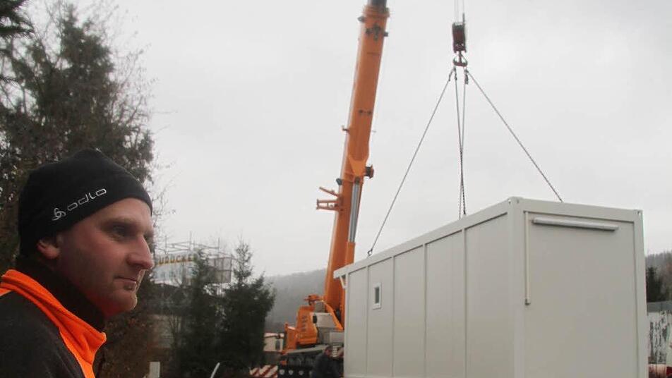 Mit lautem Getöse hievt ein Schwerlastkran eine Weltneuheit an seinen Standort. Es handelt sich um einen neun mal drei Meter großen Wildsammelcontainer, der auf dem Gelände der Untersteinacher Firma Purucker einen Platz findet.