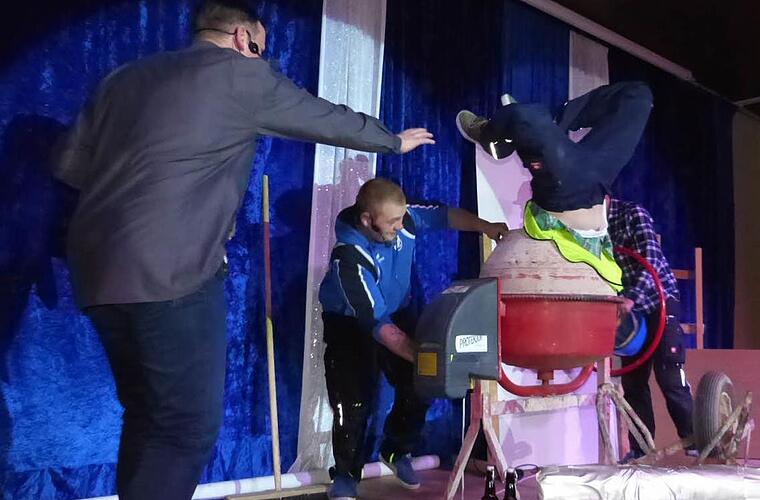 Gekonnt führte Nadine Weber durch das abwechslungsreiche, fünfstündige Programm. Das Tanzpaar Robin & Nelly wurde nach einem tollen Auftritt mit viel Applaus belohnt. Das Narrenvolk rieb sich dann verwundert die Augen, als Bauarbeiter Schubkarre, Betonmischmaschine und Sprengvorrichtung auf die Showbühne hievten. Des Rätsels Lösung war schnell klar: Die Gewerbeaufsicht stellte einen Arbeitsunfall, der sich im vergangenen Sommer ereignet hatte, realistisch nach. Die Besucher schüttelten sich vor Lachen, als einer der "Arbeiter" kopfüber in die Mischertrommel stürzte und ein sich in der Baugrube befindlicher Kollege plötzlich durch die Luft flog.