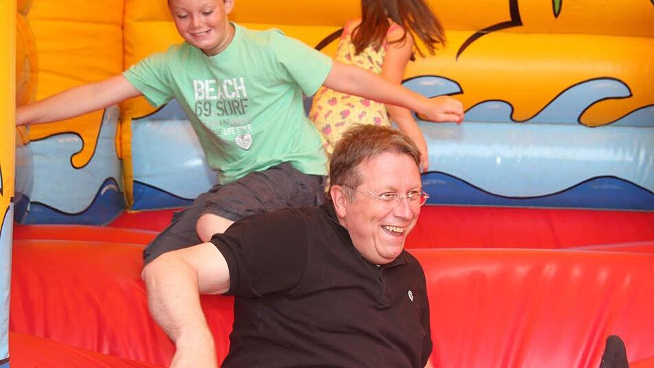 Carlos allerdings war schneller und hüpfte schon mal zur Probe quer durch die Burg. Trotzdem ließ sich der OB nicht zwei Mal bitten, zog die Sneakers aus - und versuchte mit den kleinen Kulmbachern mitzuhalten. Doch was so mühelos und spaßig ausschaut, ist gar nicht so einfach. Denn die aufblasbare Hüpfburg gibt nach - und je mehr Gewicht man auf die Waage bringt und je länger man auf einem Fleck stehen bleibt, desto mehr sinkt man ein. "Du musst hüpfen", rief noch ein Mädchen. Doch es war schon zu spät. Schramm geriet ins Straucheln, versank hoffnungslos im Gummi der Hüpfburg und lachte sich mit den Kindern kaputt.