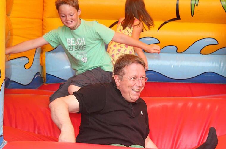 Sich in einer Hüpfburg zu bewegen, ist gar nicht so einfach. Diese Erfahrung musste der Kulmbacher Oberbürgermeister Henry Schramm am Mittwoch machen. Wer etwas mehr wiegt und auf einer Stelle stehen bleibt, kann schnell das Gleichgewicht verlieren...