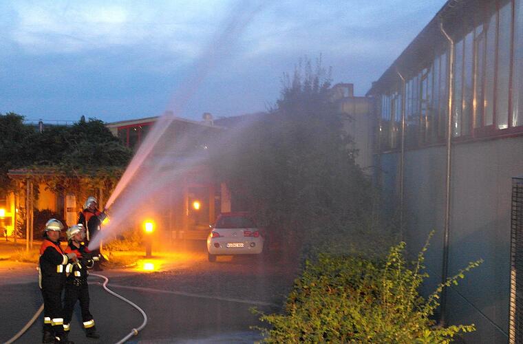 Das Szenario, das den zahlreichen Schaulustigen am Abend bei der Dörnhöfer-Stahlbau GmbH am Kreuzstein geboten wird, wäre der Alptraum für jede Firma.