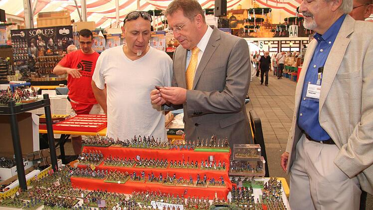 Im Bierstadel, wo vor wenigen Tagen noch viele Kulmbacher und Auswärtige feuchtfröhlich feierten, herrscht jetzt wieder dichtes Gedränge: Zum 25. Mal findet hier die Zinnfigurenbörse statt. Es ist ein Treffpunkt für Menschen aller Nationalitäten. Man hört viele italienische Worte, aber auch aus Belgien, Dänemark, aus Griechenland, Polen, Tschechien Russland und sogar aus Japan und Sri Lanka sind Sammler und Händler gekommen. Und schon eine halbe Stunde nach der Öffnung der Börse herrscht dichter Betrieb.