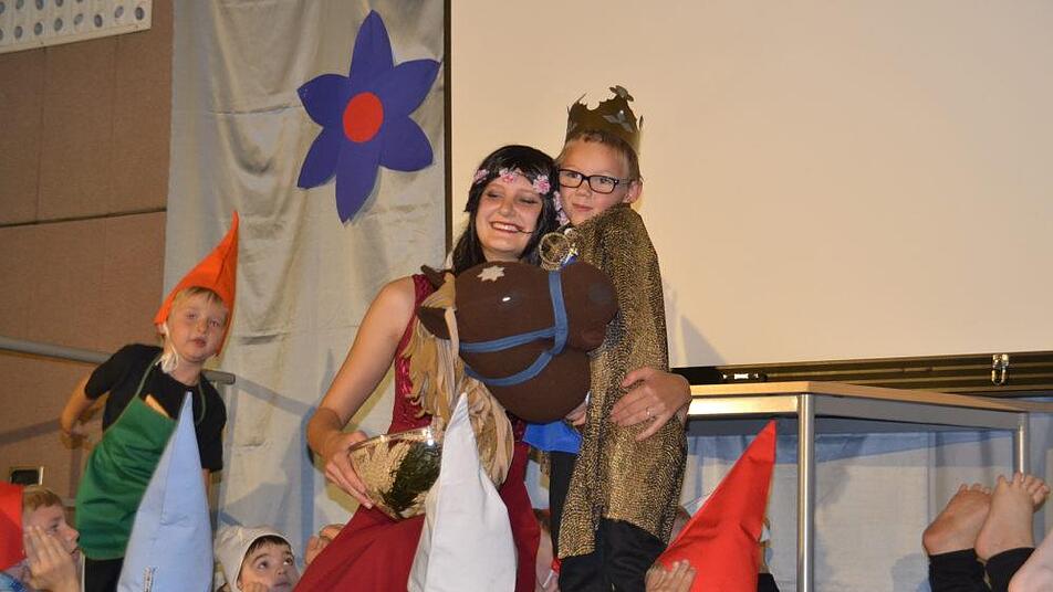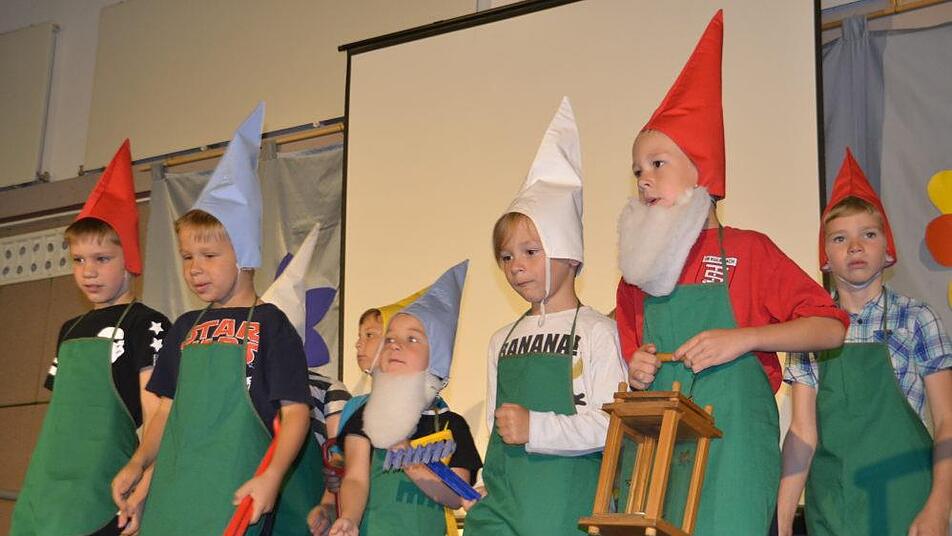 "Wie geht das, keine lange Rede zu halten, wenn man so viele Menschen begrüßen und sich bei so vielen Akteuren bedanken muss?", reagierte Schulleiter Klaus Altenburger auf die Bitte einer Schülerin. Doch er schaffte es und somit konnten die Mitwirkenden am Festprogramm pünktlich starten. Den Anfang machte der G-Chor zusammen mit der Klasse 3a. Für ihren Tanz haben sich die Schüler der Klasse D1Aa die Bewegungen selbst ausgedacht und einstudiert. Ein kleines Highlight war die Darbietung der Jüngsten aus der Schulvorbereitenden Einrichtung mit ihrem putzigen Zwergentanz, bei dem sogar das Schneewittchen und der Prinz auf seinem Pferd nicht fehlten.