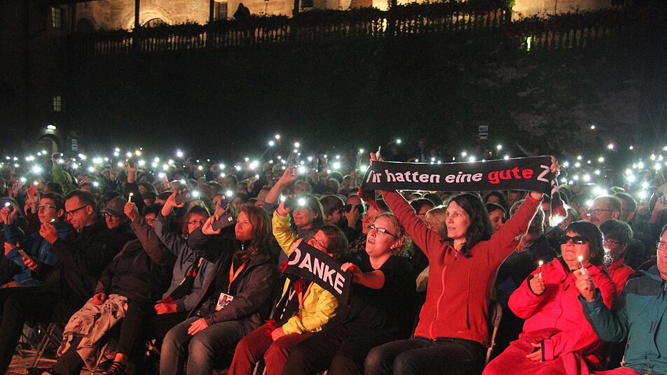 Hunderte von Handytaschenlampen brannten, als Abschiedslied der "Wise Guys" erklang. Sie tauchten den Schönen Hof in ein geradezu magisches Licht. Viele Zuschauer hatten Fan-T-Shirts an, hielten Schals mit der Aufschrift "Wir hatten eine gute Zeit" oder dem simplen Wort "Danke" hoch. Die Säger gaben den Dank zurück: "Es war eine schöne Zeit".