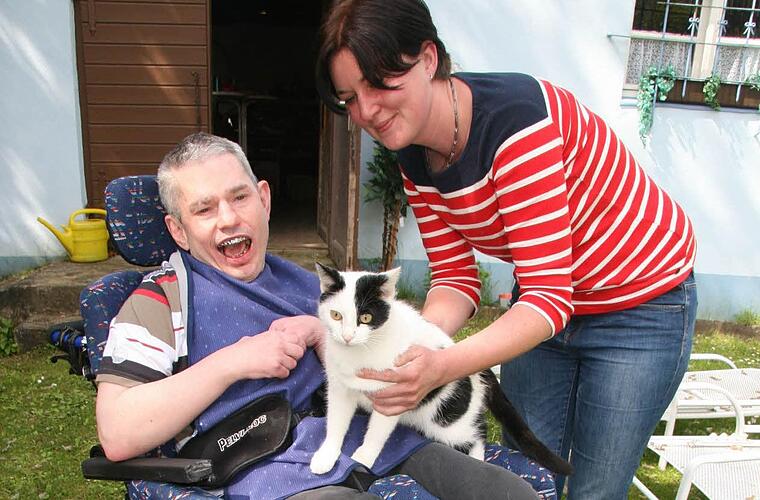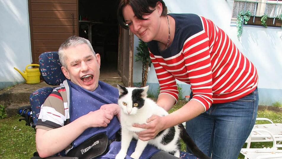 Andy, ein 38-jähriger Mann, lacht lautstark, als ihm Heimleiterin Claudia Mai den Hauskater Karl-Heinz auf den Schoß setzt. Und seine Freude steckt an. Jeder der Menschen, die in der Einrichtung leben, hat ein besonderes Schicksal hinter sich. Einige Bewohner sind durch einen Unfall mehrfach behindert, andere sind von Geburt an schwerstbehindert. Viele können nicht selbstständig laufen und sind ihr Leben lang ans Bett gefesselt.