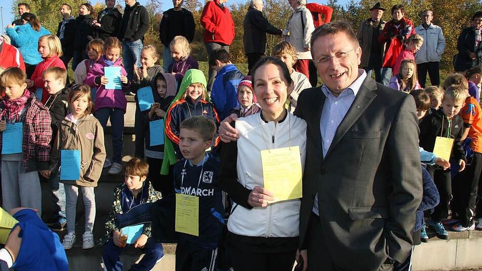 Jede Runde bringt zehn Euro Auch die Kulmbacher OB-Kandidaten ließen sich nicht lumpen, wobei Oberbürgermeister Henry Schramm sich eine prominente Läuferin ausgesucht hatte - nämlich Schulleiterin Kathrin Sigg persönlich. "Ich will schon so zehn Runden schaffen", sagte sie vor dem Lauf und rechnete schon mal durch, dass ihr jede Runde zehn Euro bringt. Letztlich wurden es sogar zwölf Runden, doch Schramm nahm's gelassen und öffnete gerne den Geldbeutel. "Besser, als wenn ich selbst hätte laufen müssen", lachte er.
