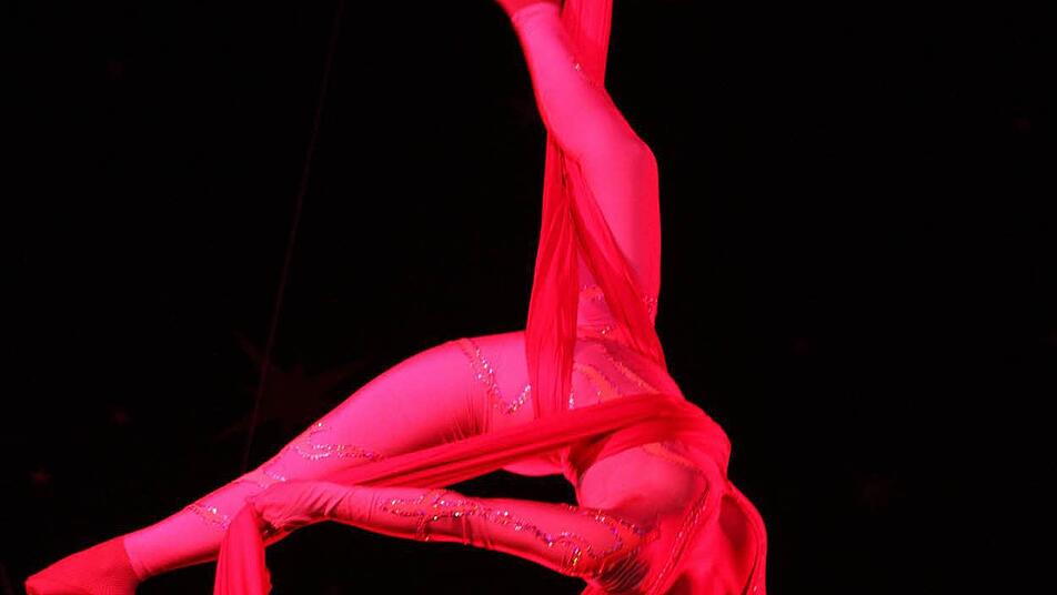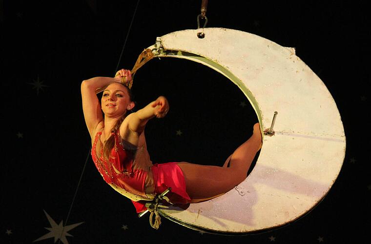 Julia turnte unter der Kuppel. Und Miss Luna verrenkte sich in der Mondsichel - ebenfalls in der Zirkuskuppel. Leila Mak, die Geschäftsführerin des Zirkus, wagte sich ans Vertikalseil. Sie gilt als eine der besten Vertikalseilartistinnen der Ukraine. Sie wickelt das Seil um, turnt unter der Kuppel des Zirkuszelts.