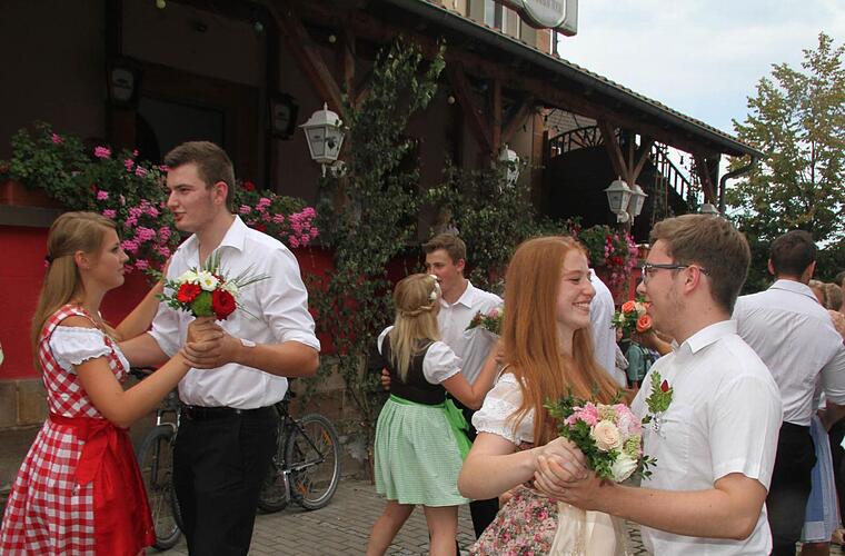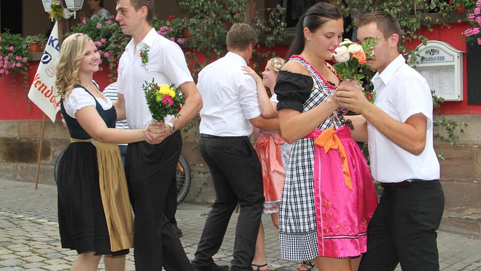 Die Melkendorfer Kerwa lebt. Angeführt von Fahnenträger Max Angermann holten die Ortsburschen am sonntag ihre Madla mit einem Festzug ab.