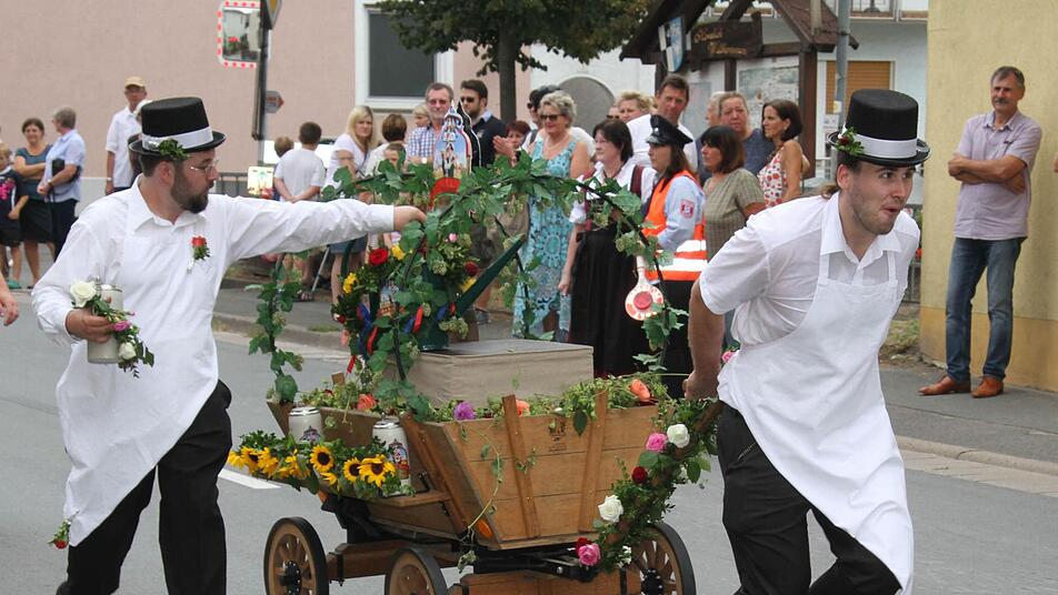 Pfarrer Klaus Spyra freute sich, dass die Kerwatradition in Melkendorf so lebendig ist. "Es ist wirklich eine unglaubliche Leistung, was die jungen Leute hier so auf die Beine stellen", so der Pfarrer. Die jungen Plotzer schenkten Bier aus, zogen den Kerwawagen. Und natürlich riefen sie beim Festzug unzählige Male "Wer hot Kerwa?" - "Mir hom Kerwa!". Dieser Schlachtrufgehört einfach zu jeder echten fränkischen Kerwa.