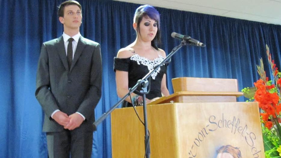 "Seien wir mal ehrlich: Es hat Tage gegeben, wo wir früh nicht aus dem Bett wollten." Julius Jung (Klasse 10 e) fasste mit seiner Klassenkameradin Katja Müller ein paar Gedanken zum Abschied zusammen. Nach sechs Jahren - bei manchen auch etwas länger, gestand er grinsend - warteten am Freitagabend 112 Realschüler der Viktor-von-Scheffel-Schule ein letztes Mal gemeinsam in der bis auf den letzten Platz besetzten Schulaula gespannt mit ihren Angehörigen und geladenen Gästen auf die Zeugnisübergabe. "Wir haben aber auch viel Teamwork und Toleranz gelernt", ergänzten die beiden Zehntklässler, die sich im Namen ihrer Mitschüler bei Eltern, Lehrern und Schulpersonal bedankten.