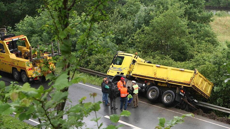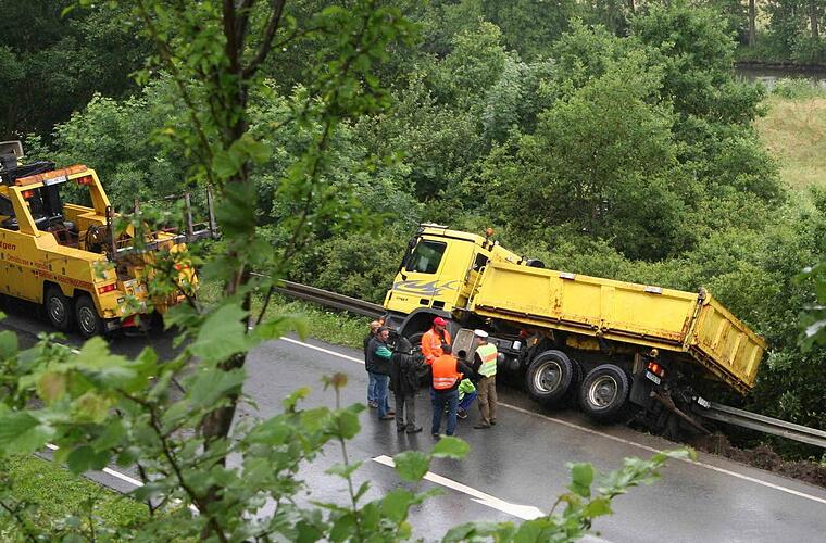 Der mit Erdaushub beladene, rund 20 Tonnen schwere Lkw blieb schließlich in Schräglage an der Leitplanke hängen und drohte im aufgeweichten Boden etwa fünf Meter den Hang abwärts zu kippen. Durch einen Abschlepplaster wurde der 20-Tonner zunächst mit Stahltrossen gegen das Umkippen gesichert, bis er von einem Autokran aus dem Bankett gezogen werden konnte.