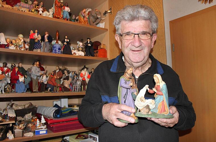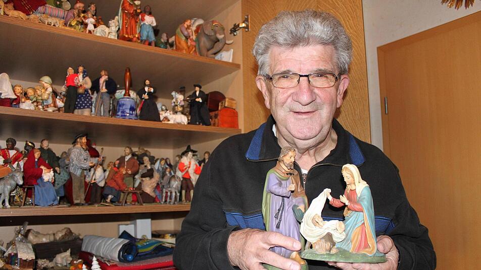 Über Weihnachten macht sich Florian Hofmann eigentlich täglich Gedanken. Nicht über das Fest, sondern die Geschichte, die Menschen seit mehr als 2000 Jahren fasziniert und bewegt. Der passionierte Krippenbauer hat auch bei einem sommerlichen Spaziergang ein Auge für so manch nützliche Zutat aus der Natur. Wenn es ans Gestalten der Szenen zu Christi Geburt geht, kann der Rentner aus einem riesigen Fundus schöpfen. Figuren in vielerlei Größen und Macharten, fertig gekauft oder selbst gestaltet und von seiner Frau eingekleidet, füllen Schränke. Nicht nur Maria, Josef und das Jesuskind drängen sich variantenreich auf den Einlegeböden. Hirten, Bauersleut', Kinder, Könige, Ochs und Esel, Schafe, Engel oder Elefant sind hinter Holztüren und in Schubladen versammelt. Für die dazu passenden Kulissen - ob fränkisches Fachwerkhaus oder orientalische Höhle - reicht ein Zimmer nicht aus. Wie viele Krippen er hat? Da kann Florian Hofmann nur schätzen: "Vier- bis fünfhundert vielleicht."