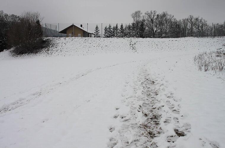 Spuren im Schnee deuten noch am Montagmorgen auf die Untersuchungen der Polizei hin. Die Einsatzkräfte hatten am Sonntag versucht herauszufinden, wie es in der Nacht zuvor zum Tod einer 65-Jährigen auf einer Wiese unweit der Fußball- und Tennisplätze kam.