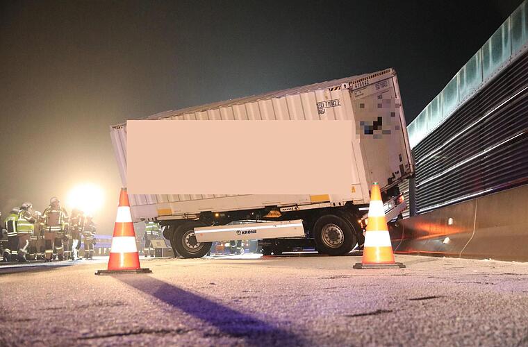 Zudem leuchtete die Feuerwehr die Unfallstelle aus und sicherte den Lastwagenanhänger bis zum Eintreffen eines Spezialkrans. Mit Einsatz des schweren Gerätes wurde der Anhänger von der Betongleitwand gehoben und abgeschleppt. Bis zum Abschluss der Bergungsarbeiten war die Autobahn in nördliche Richtung für vier Stunden gesperrt. Am Lastwagen und der Gleitwand entstand ein Gesamtschaden von rund 10.000 Euro.