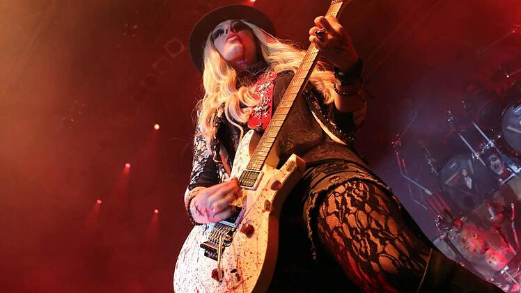Blondine an blutiger Gitarre 1500 Besucher fanden sich in der Stadthalle ein, und abermals war es beim Publikum ein Thema, weshalb das als Open-Air angekündigte Konzert bei bester Wetterlage in der Stadthalle stattfand. Der guten Laune tat das irgendwann aber kaum noch Abbruch, denn die Show war unterhaltsam, und die Musiker verstanden ihr Handwerk. Allen voran beispielsweise Orianthi Panagaris, ein griechischer blonder Hingucker an der blutig-bespritzten Gibson-Gitarre. Die Frau ist immerhin eine Entdeckung von Carlos Santana. Oder Glen Sobel: Der Mann trommelt auf zwei Bass-Trommeln, einer Unmenge an Becken und weiteren Percussion-Utensilien, aber er trägt ein Lachen im düster geschminkten Gesicht.
