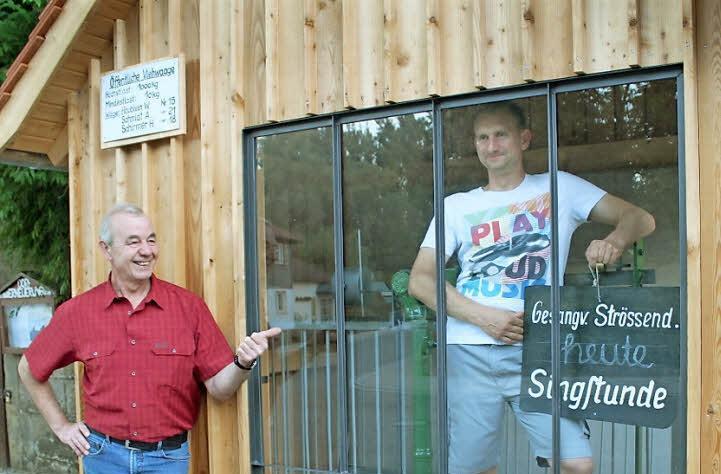 Das alte Wiegehäuschen hatte keines, dafür hat das neue eines, welches Sicht auf die Apparatur gewährt und überdies noch metallen eingefasst wurde, so dass es mit den Gitterstreben am alten Gewächshaus gegenüber harmoniert. "Damit das "zum Stil a bissla passt", erklärt Sünkel. Mit dem Fenster habe man ein wenig getrickst, aber die Außenmaße seien in etwa original geblieben. Selbst die Waage sei noch funktionsfähig, wenngleich nicht geeicht. Dafür steht sie jetzt auf einem höheren Fundament, damit das Wasser nicht reinzieht. "Unser Gartenbauverein ist einer der ältesten im Kreis", lässt Sünkel wissen. 126 Jahre alt und entstanden aus dem "Obstbauzuchtverein". "Der hat scho immer a weng andere Sachen gemacht", formuliert Sünkel, auf eine Tradition verweisend. Die, sich für mehr als nur Obst, Gemüse und Blumen stark zu machen. In Sachen Dorfverschönerung und Geselligkeit engagiert sich der Verein. Der Maibaum, das Wintersonnwendfeuer, die Bank im Ortskern, die Glocke im Kirchturm, die Pflanzinseln im Ort - all das sind Belege dafür. Jetzt auch ein neues, altes Wiegehäuschen.