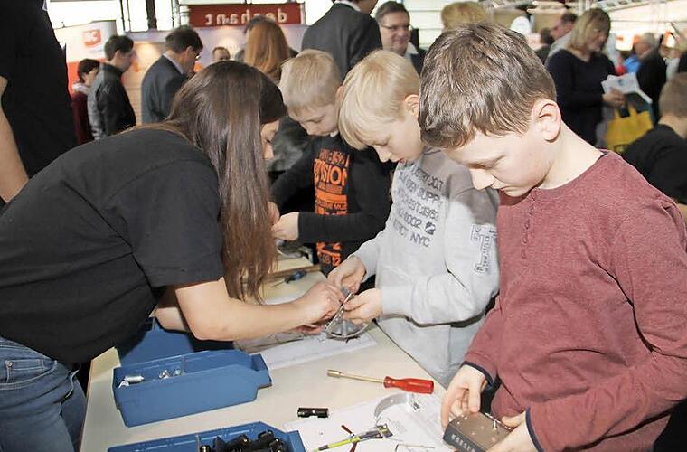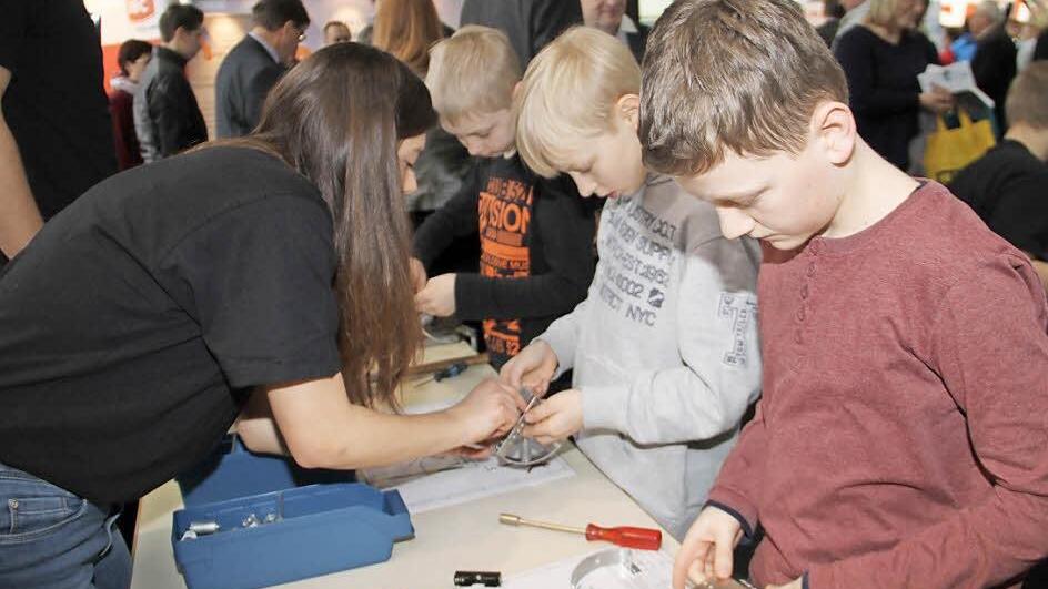 In der zur Messehalle umfunktionierten Turnhalle waren vor allen die technisch-handwerklichen Berufe untergebracht. Ausprobieren stand an vielen Messeständen hoch im Kurs. Von der dekorativen Tomatenrose über die Nähmaschine bis hin zum Lötkolben war vieles möglich.