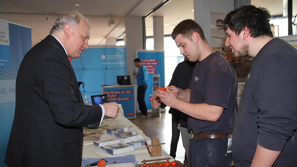 Nicht jeder, der sich über das vielfältige Angebot informierte war gleich auf der Suche nach einem Ausbildungsplatz. "Ich kenne meinen Beruf, ich wollte mich mal umschauen, wie es in anderen Berufen ist", sagt Steffen Müller. Der Straßenbauer lässt sich von Andreas Poth, dem Leiter des Kurhotels an der Obermain-Therme, erklären, wie aus der Schale einer gewöhnlichen Tomate eine dekorative Rose wird. Keine Hexerei, wie der Straßenbauer feststellen muss. Weder das Abschälen der Schale bereitet ihm nennenswerte Probleme noch das Aufrollen zur Rose. "Man sieht, dass auch ein Straßenbauer mit filigranen Dingen umgehen kann", lobt Poth.