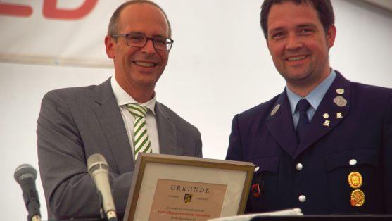 So manches überreichte Geschenk spiegelte die Anerkennung für die rührige Ebensfelder Wehr. Kreisbrandrat Vogler übergab dem Festausschuss-Vorsitzenden Holger Lunkenbein zum Jubiläum eine gerahmte Urkunde. Von Staatsministerin Huml gab es im Namen der Staatsregierung einen schönen Wimpel.