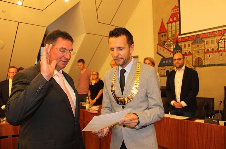 Etliche wollten ihm schon vorab gratulieren, denn mit der Ankündigung der Stadtratssitzung war sein Name als Nachrücker für Christian Schedel auch öffentlich genannt worden. Doch Bernd Krauß legte Wert auf die ordentliche Reihenfolge: erst der Beschluss des Stadtrats und die Vereidigung, dann die Glückwünsche. So lief es dann am Montagabend auch der Reihe nach ab, und der 50-Jährige aus Mistelfeld konnte als neues Mitglied des Stadtrates von den Kollegen willkommen geheißen werden.