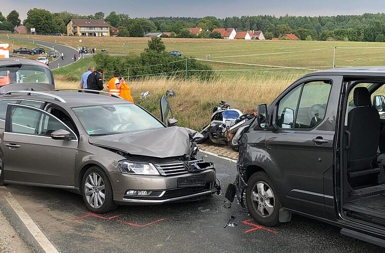 Bei einem schweren Verkehrsunfall bei Weismain zwischen Burgkunstadt (Landkreis Lichtenfels) und Stadelhofen (Landkreis Bamberg ) wurden am Mittwoch sechs Personen verletzt. Ein Motorradfahrer erlitt schwere Verletzungen und wurde mit dem Hubschrauber ins Krankenhaus gebracht.