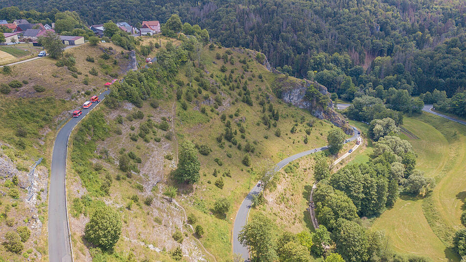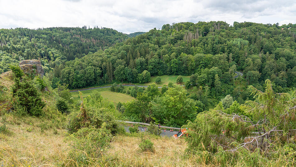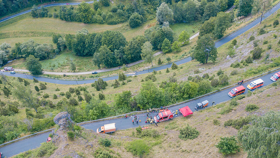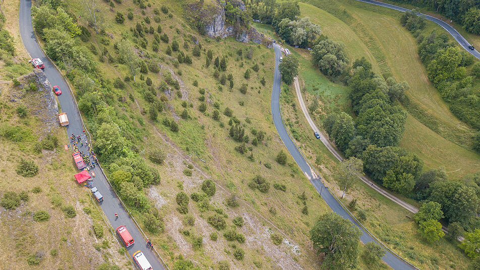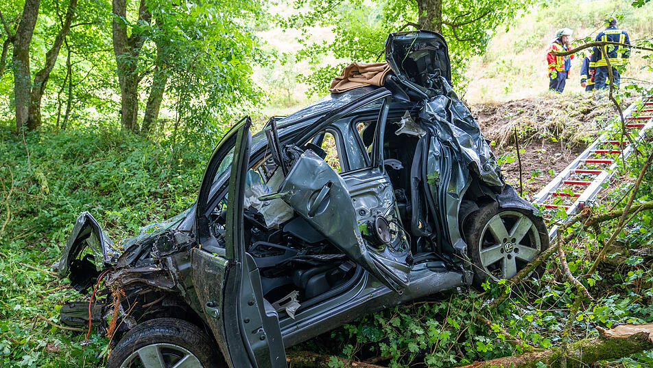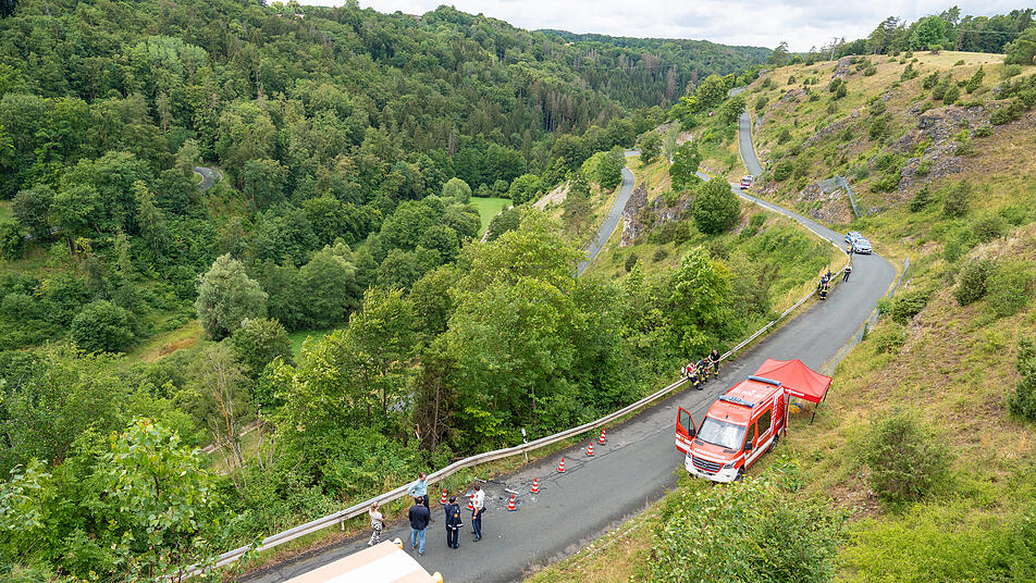 An einem Steilhang in Weismain hat ein Auto die Leitplanke durchbrochen und ist über 70 Meter in die Tiefe gestützt. Der Fahrer starb noch an der Unfallstelle. Seine Beifahrerin überlebte schwer verletzt und musste von einem Rettungshubschrauber in ein Krankenhaus geflogen werden.