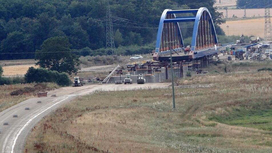 Am Dienstag brachten Ingenieure und Techniker das erste Bogensegment der ICE-Brücke zwischen Unterzettlitz und Wiesen in seine endgültige Lage. Die Arbeiten waren durch die hochsommerliche Hitze erschwert.